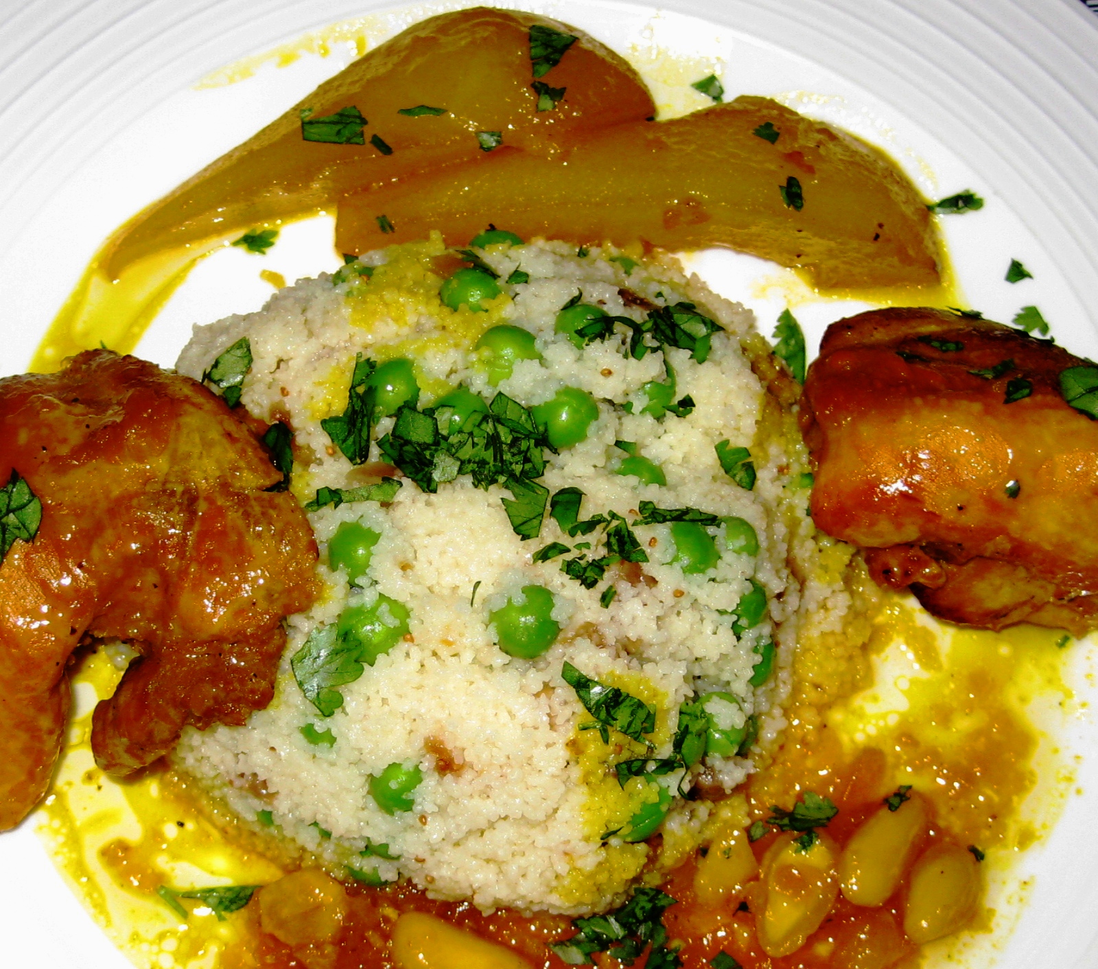 2 uien, geraspt – 3 t knoflook, geperst –  3 el honing – 2 el verse koriander – 1 tl gemberpoeder – mespunt saffraan – zout en versgemalen peper – 8 kippendijtjes (zonder bot) – olijfolie – 150 g amandelen – 300 ml kippenbouillon van tablet of pot – 2 stevige peren (conference) – 400 gr couscous – 4 gewelde vijgen –  200 gr (diepvries)doperwtjes – handje gewelde rozijnen – zout – peper